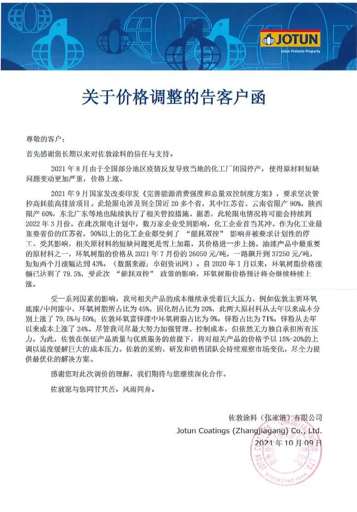 受一系列因素的影響,我司相關(guān)產(chǎn)品的成本繼續(xù)承受著巨大壓力。例如佐敦主要環(huán)氧底漆/中間漆中,環(huán)氧樹(shù)脂所占比為45%,固化劑占比為20%,此兩大原材料從去年以來(lái)成本分別上漲了79.5%與50%;佐敦環(huán)氧富鋅漆中環(huán)氧樹(shù)脂占比為9%,鋅粉占比為71%,鋅粉從去年以來(lái)成本上漲了24%。盡管我司盡最大努力加強(qiáng)管理、控制成本,但依然無(wú)力獨(dú)自承擔(dān)所有壓力。為此,佐敦在保證產(chǎn)品質(zhì)量與優(yōu)質(zhì)服務(wù)的前提下,將對(duì)相關(guān)產(chǎn)品的價(jià)格予以15%-20%的上調(diào)以適度緩解巨大的成本壓力。佐敦的采購(gòu)、研發(fā)和銷售團(tuán)隊(duì)會(huì)持續(xù)觀察市場(chǎng)變化,盡全力提供最優(yōu)化的解決方案。